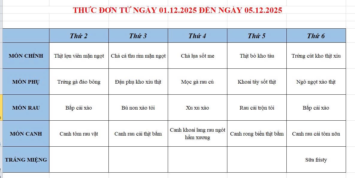Thực đơn ăn bán trú (24/11 - 28/11/2025)