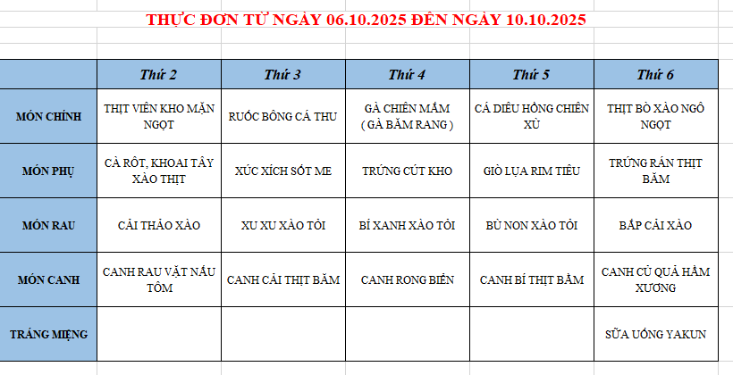 Thực đơn ăn bán trú (01/10 - 04/10/2025)