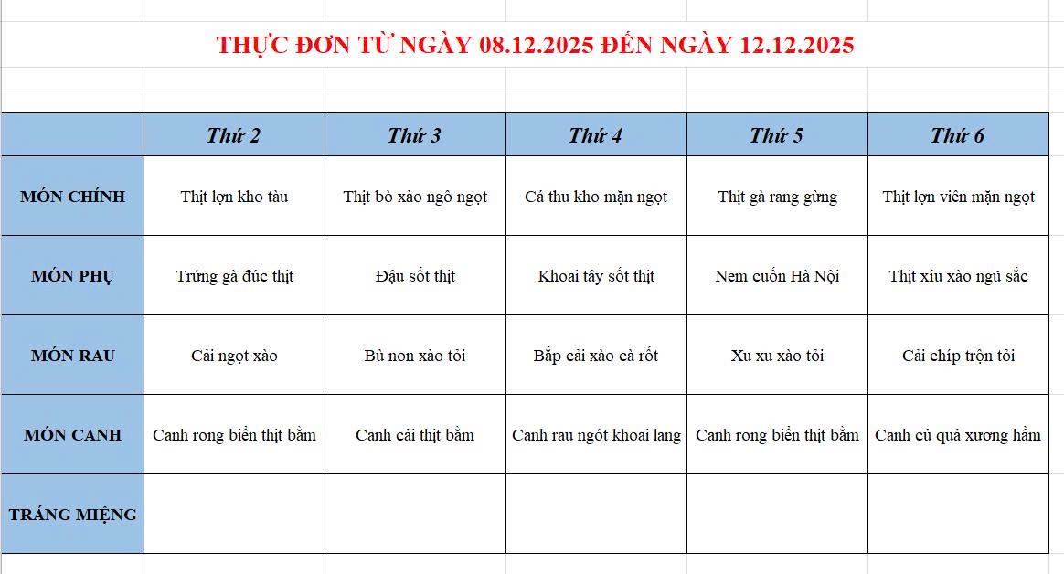 Thực đơn ăn bán trú (08/12 - 12/12/2025)