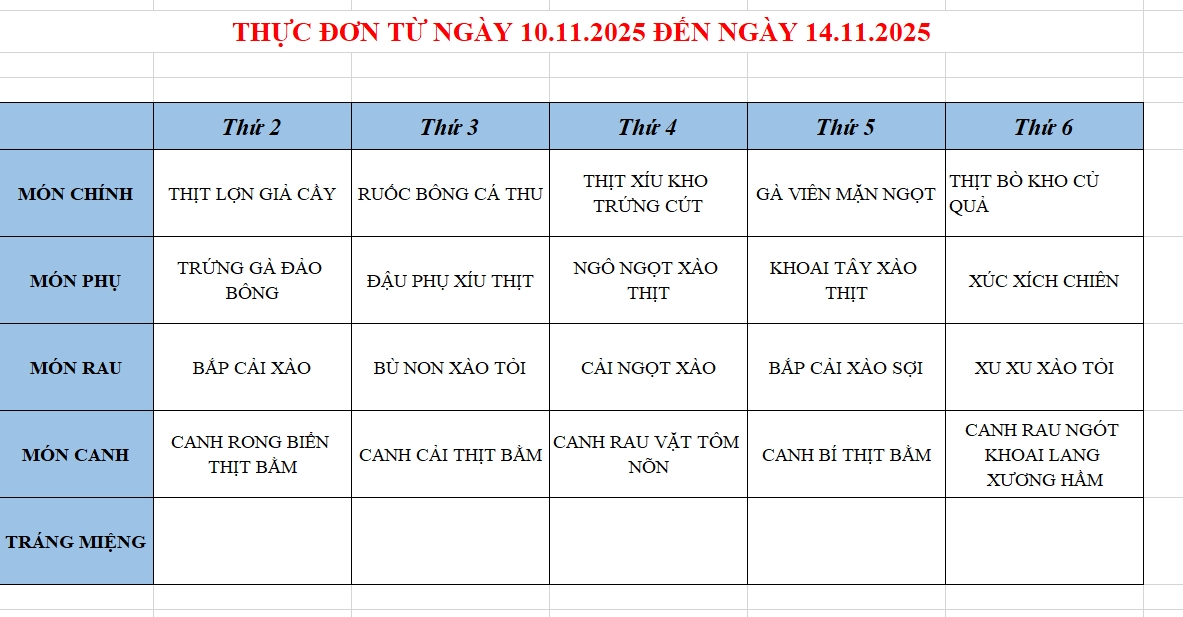Thực đơn ăn bán trú (13/10 - 17/10/2025)