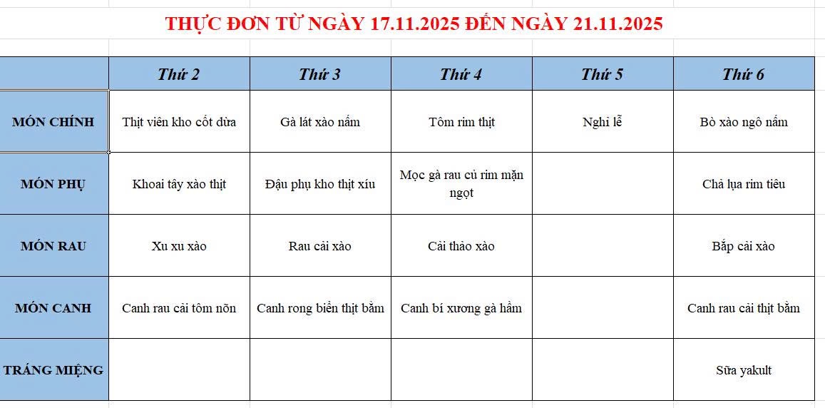 Thực đơn ăn bán trú (10/11 - 14/11/2025)