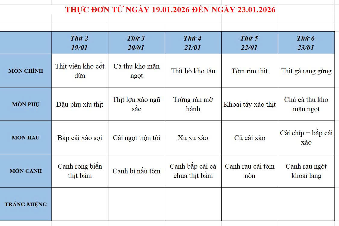 Thực đơn ăn bán trú (05/01 - 10/01/2026)