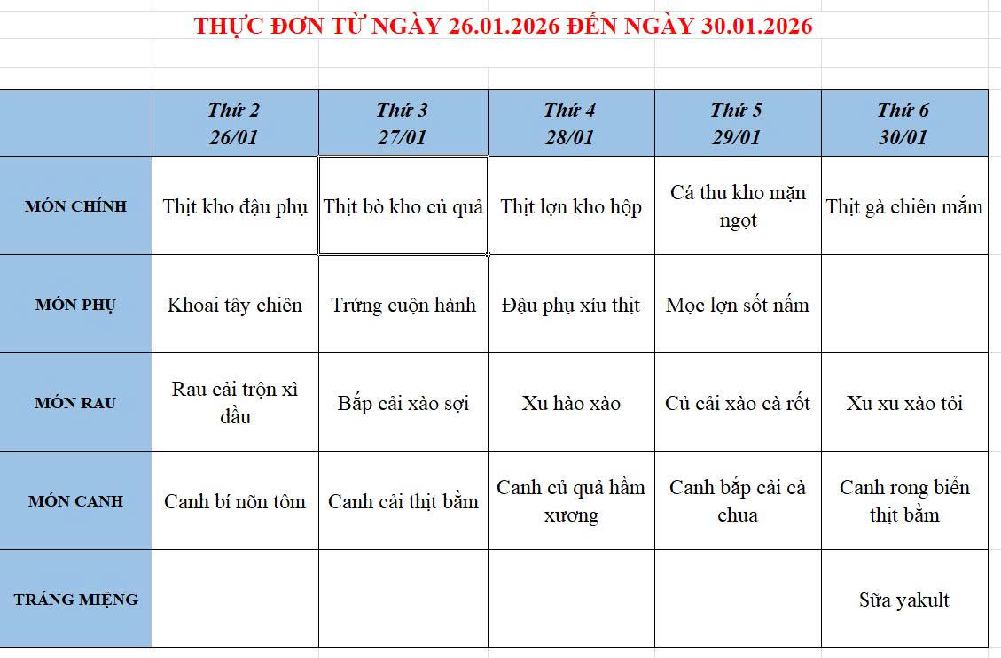 Thực đơn ăn bán trú (19/01 - 23/01/2026)