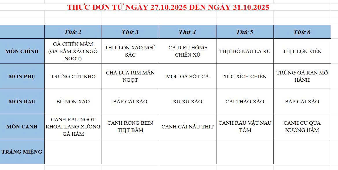 Thực đơn ăn bán trú (13/10 - 17/10/2025)