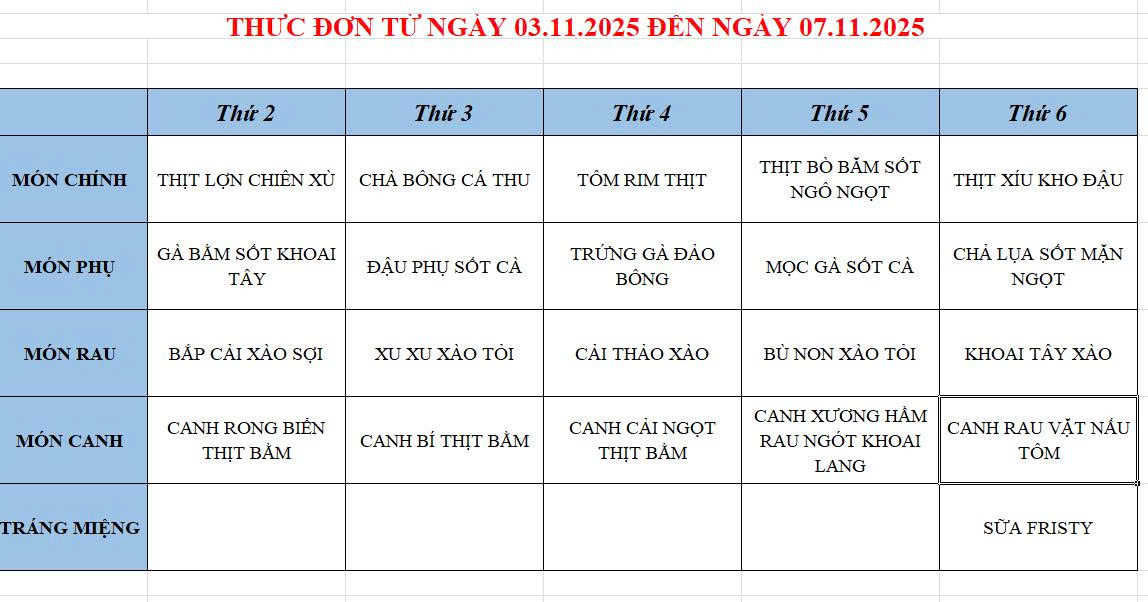 Thực đơn ăn bán trú (13/10 - 17/10/2025)